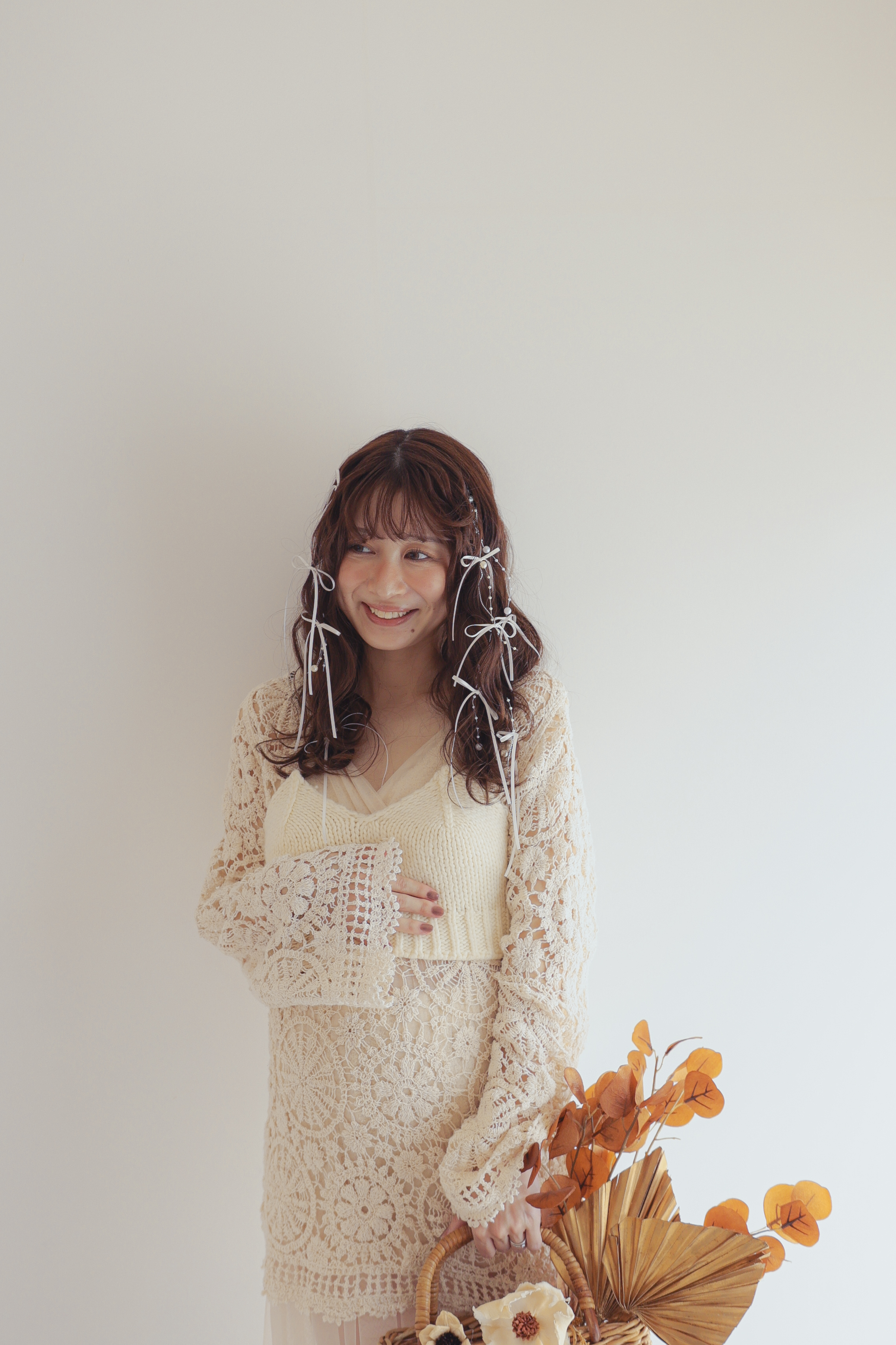 ホワイトフェミニンコーデ 丈の長めのチュールキャミワンピースにレース編みのミニワンピさらにその上から、白のニットビスチェを使用した重ね着コーデ足元やお腹をあまり露出したくない方におすすめのコーデチュールワンピ M〜Lサイズ相当(伸縮性多少あり)レースミニワンピ Mサイズ相当(伸縮性なし)ニットビスチェ Mサイズ〜Lサイズ相当(伸縮性多少あり)