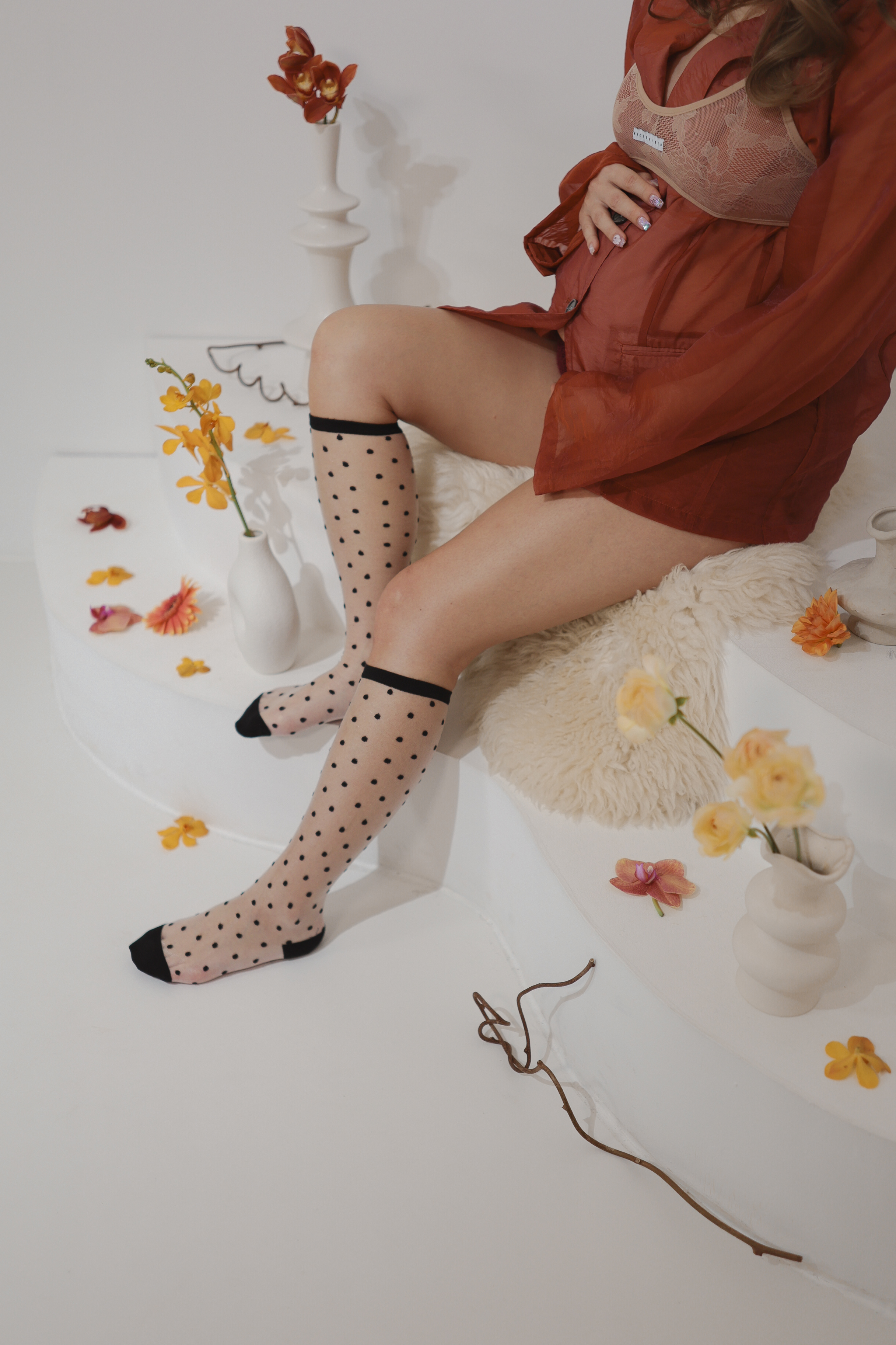 チェリーコーデ 赤色のオーガンジージャケットに、レースのブラを重ね着ニットパンツはバーガンディにソックスは黒の水玉ソックスオーガンジージャケット Lサイズ(伸縮性なし)レースブラ Mサイズ(伸縮性多少あり)ニットパンツ(バーガンディ) M〜Lサイズ相当(伸縮性あり)黒の水玉ソックス Mサイズ