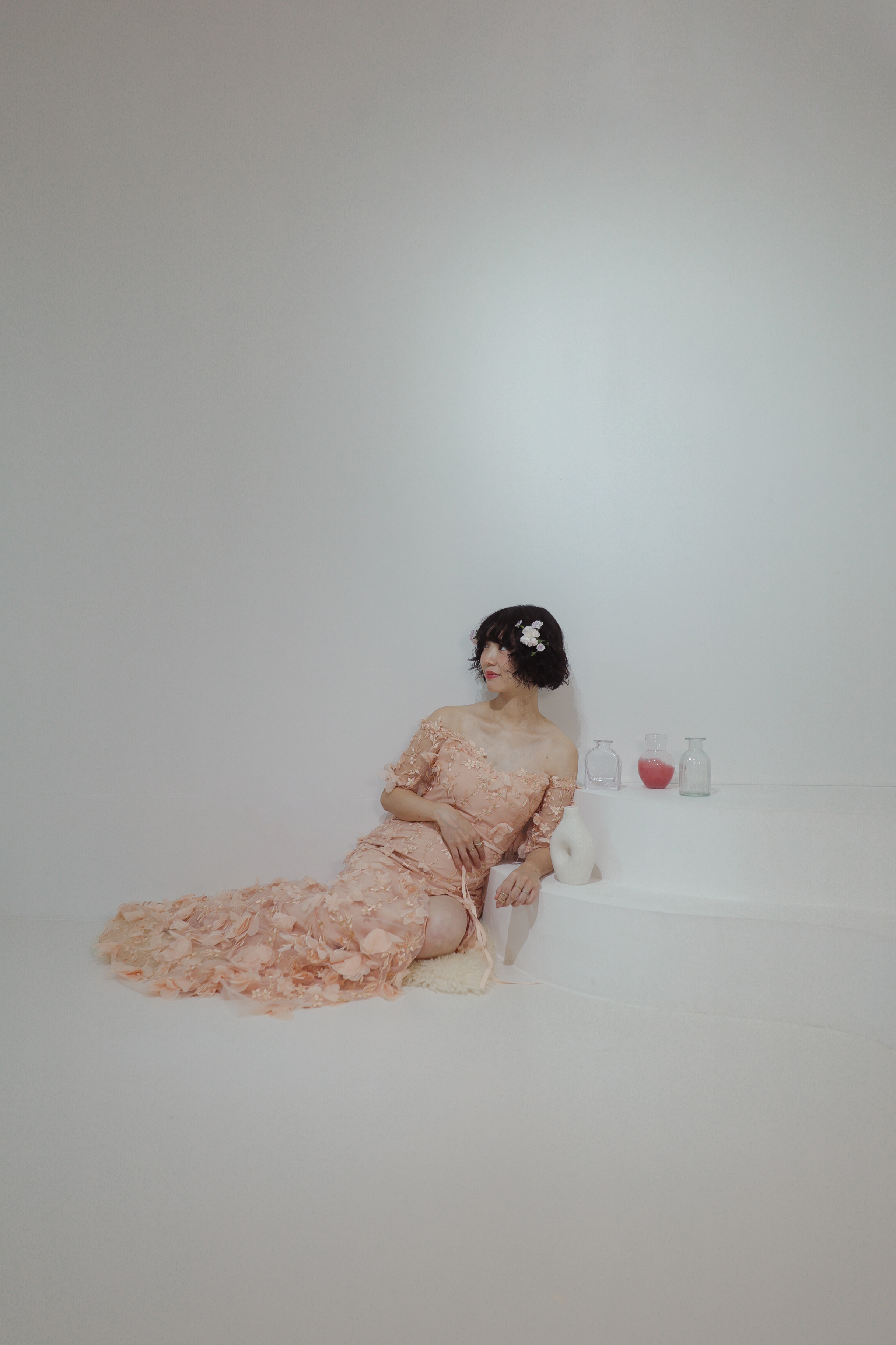 小花付きピンクドレス(¥5,500) 立体のお花がついたピンクドレスです袖はチュールのため透け感があります※元々ウェディングドレスのため撮影の時は背中のチャックを開けた状態で撮影しますサイズ S〜Mサイズ相当(伸縮性なし)
