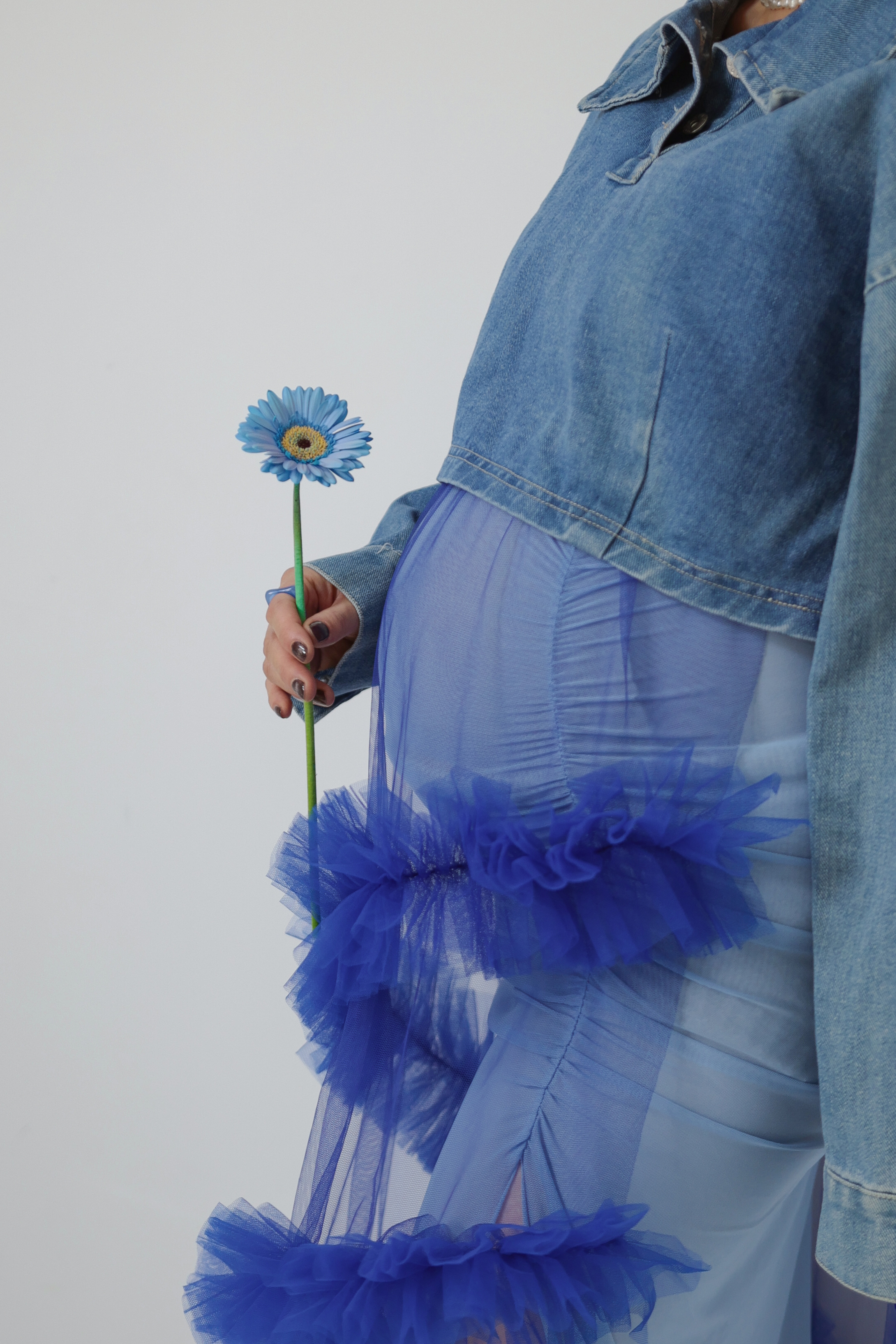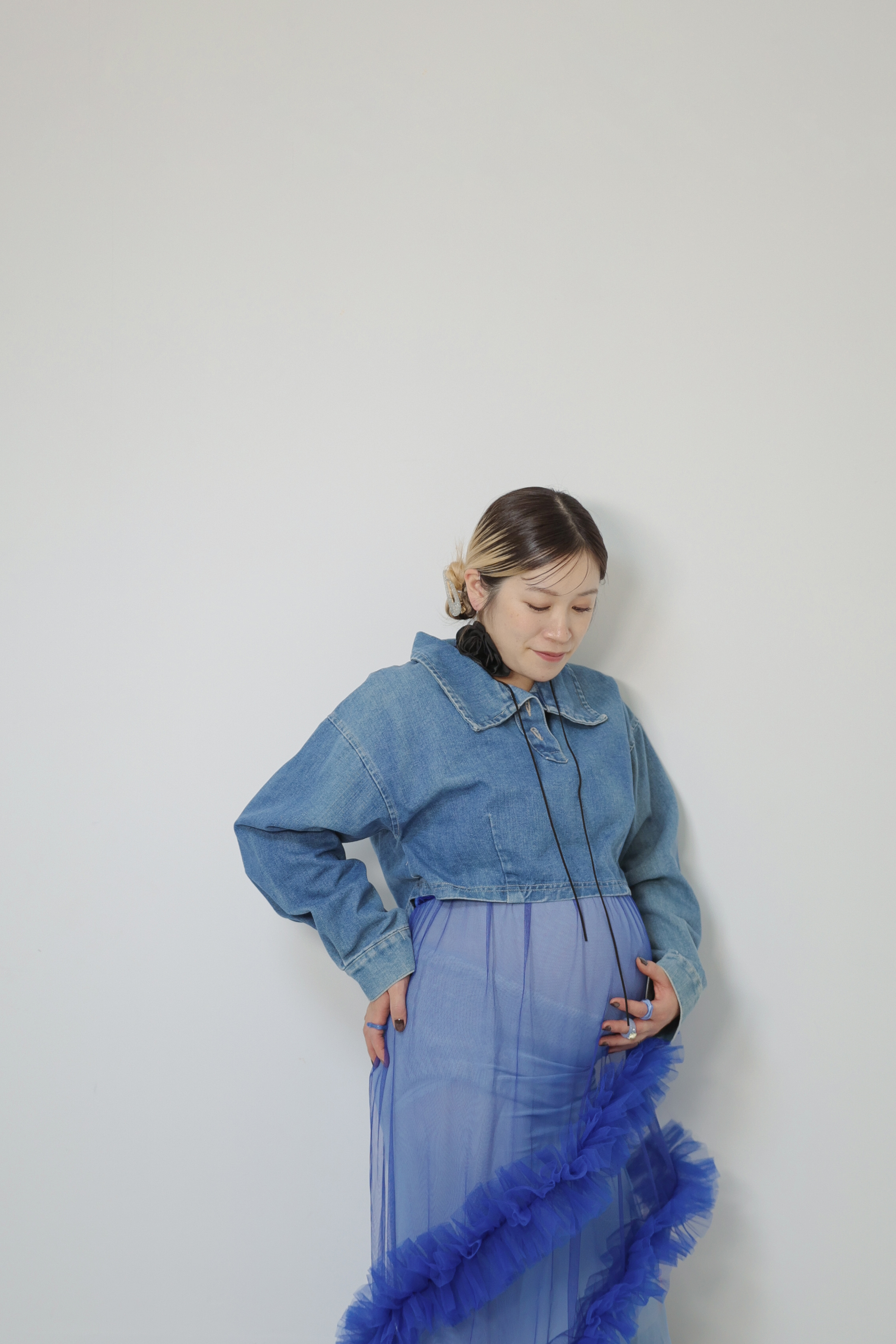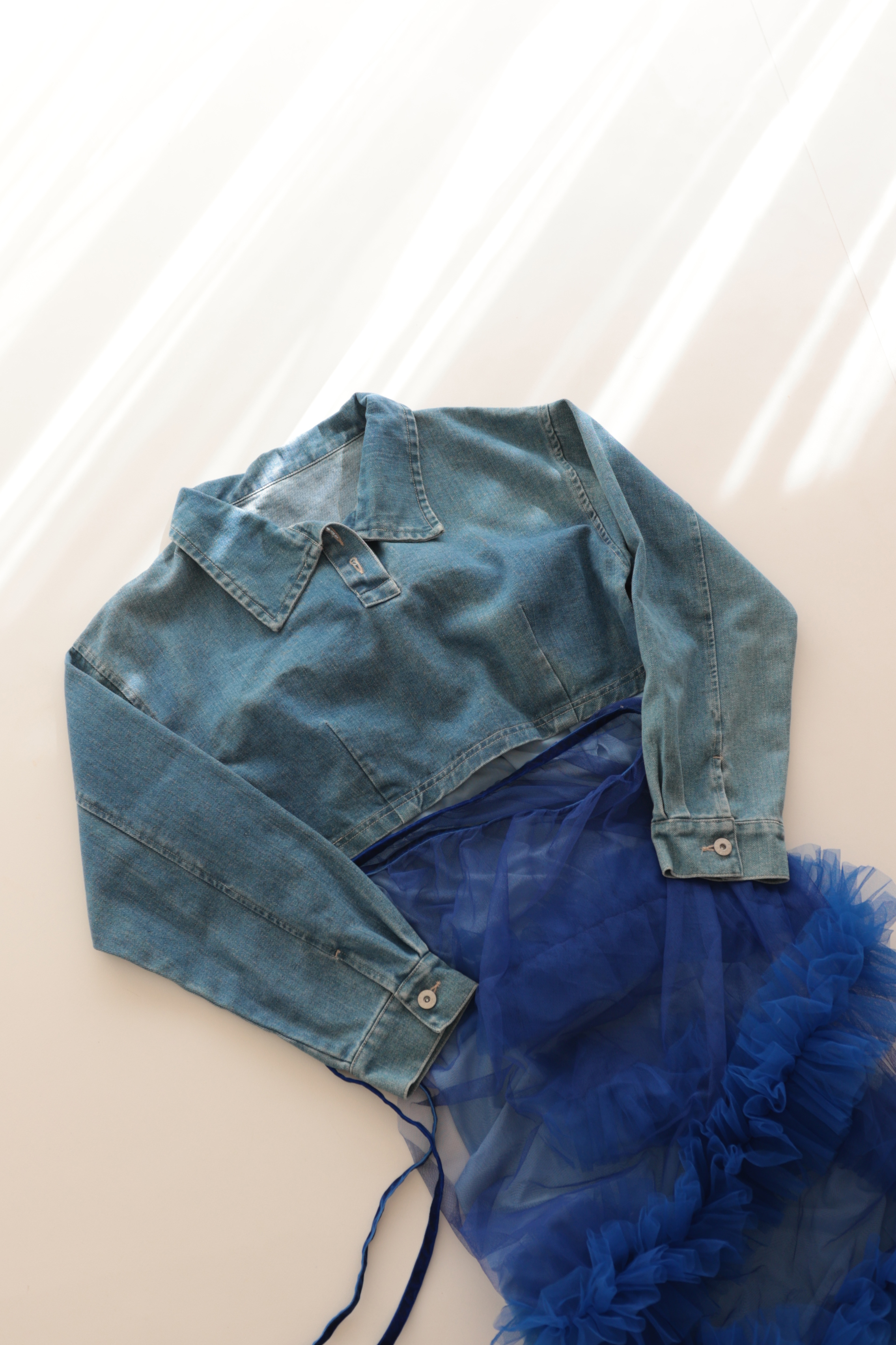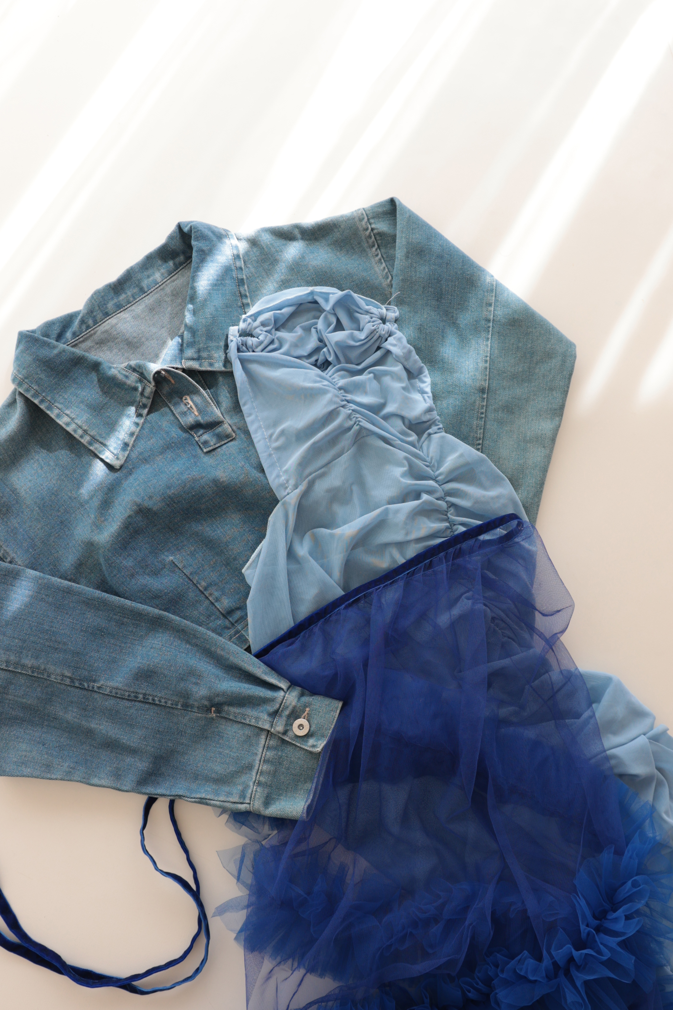 上にチュールのブルーワンピース、デニムトップス、チュール素材の巻きスカートを